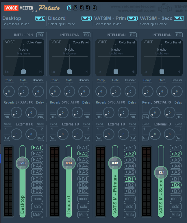 In VoiceMeeter click the B1 button for the VATSIM – Primary input and the B2 button for the VATSIM – Secondary input. This will route input 3 to B1 and input 4 to B2 in addition to sending those inputs to your headset.