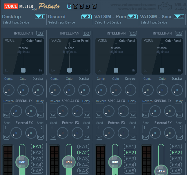 With VoiceMeeter Potato and TrackAudio it is possible to route Discord, VATSIM audio, and desktop audio independently and control each app’s audio via macros. It’s a powerful way to do things like auto-mute Discord when VATSIM audio happens, listen to multiple VATSIM frequencies at once but auto-duck frequencies when the one you’re controlling has audio traffic, route some audio to your headset and other audio to your PC speakers, etc.